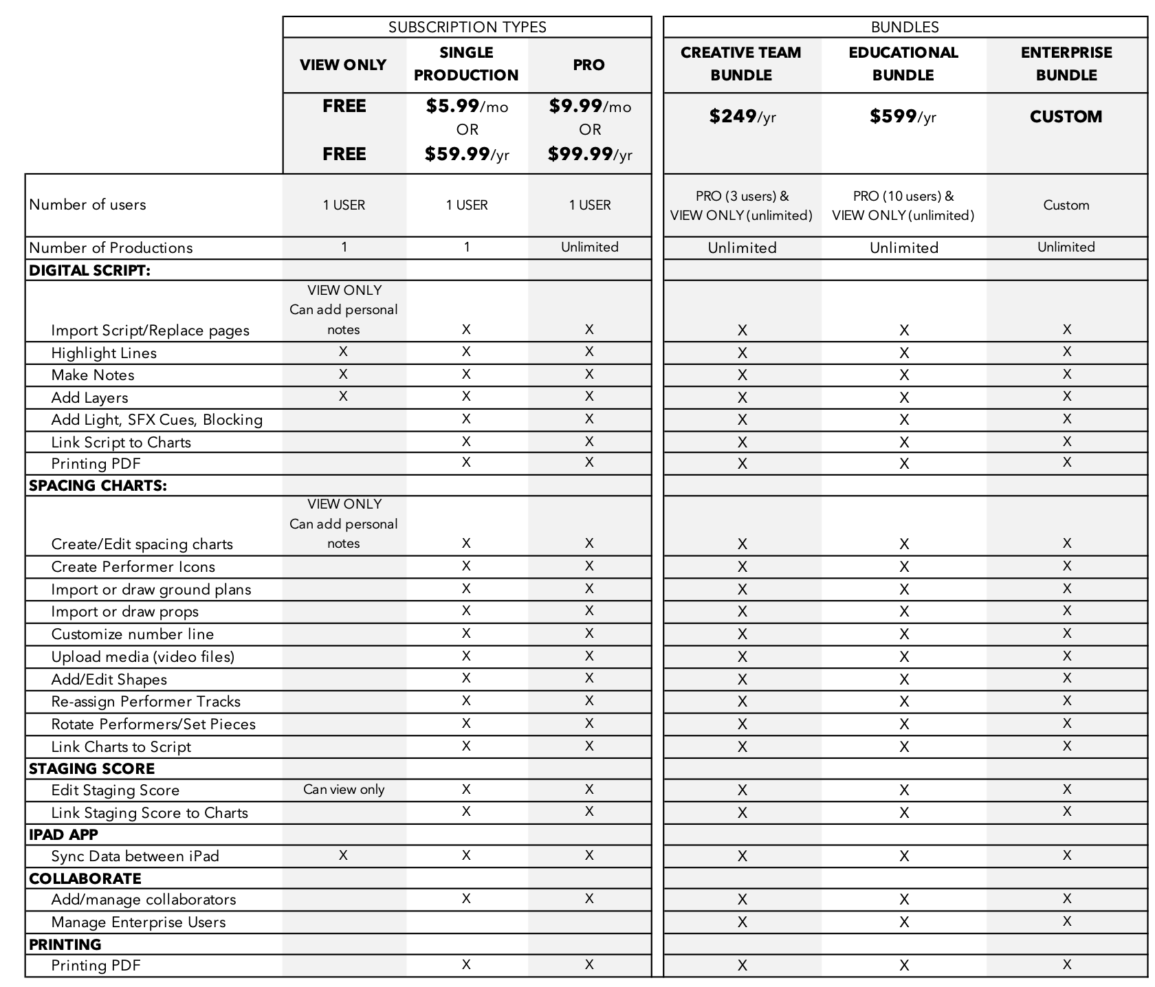SINGLE PRODUCTION ($5.99/mo or $59.99/yr) subscription has full functionality but is only limited to working with ONE PRODUCTION.